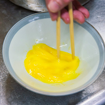 この店にしかないものを、と考案したのが半熟卵の天ぷら「玉天」。衣をまとっているせいか、揚げても黄身は半熟のまま。ただし、揚げ時間はちくわよりも短めに。黄身をうどんやちく天に絡めて食べても、また旨い。