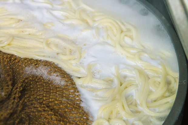 20分後、麺を取り出して器に入れ、整える。20分茹でた麺は、表面は透明だが、中心部はまだ茹できれた状態ではない。