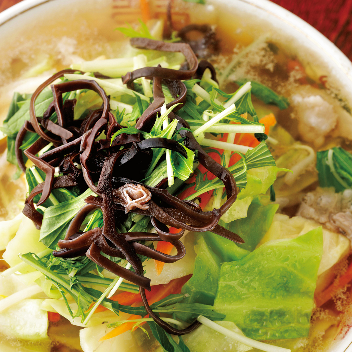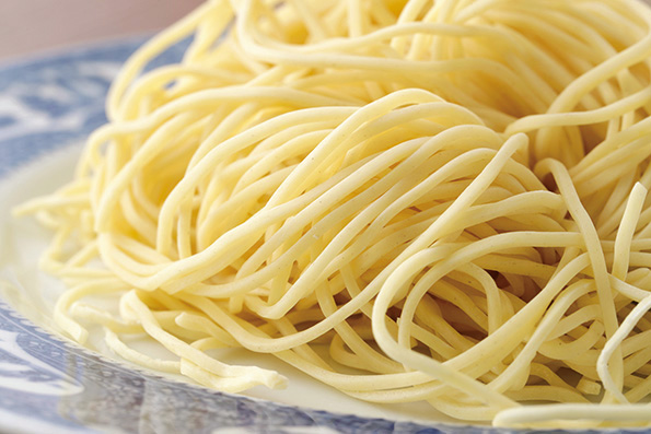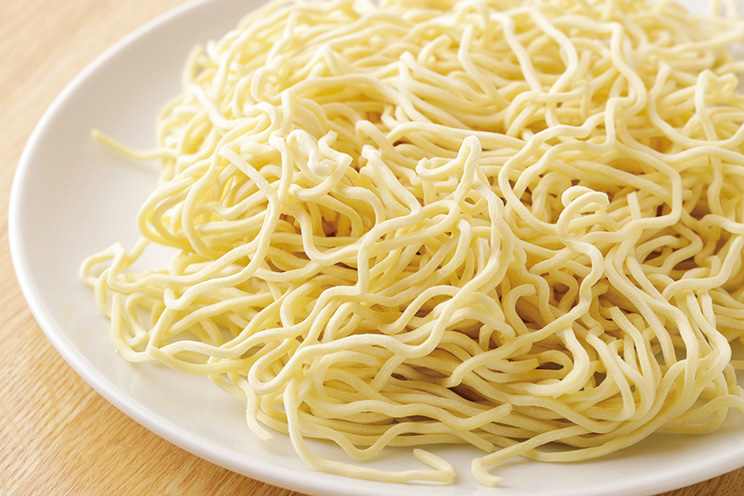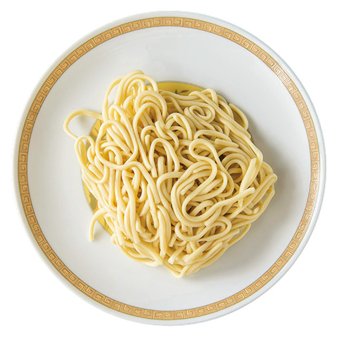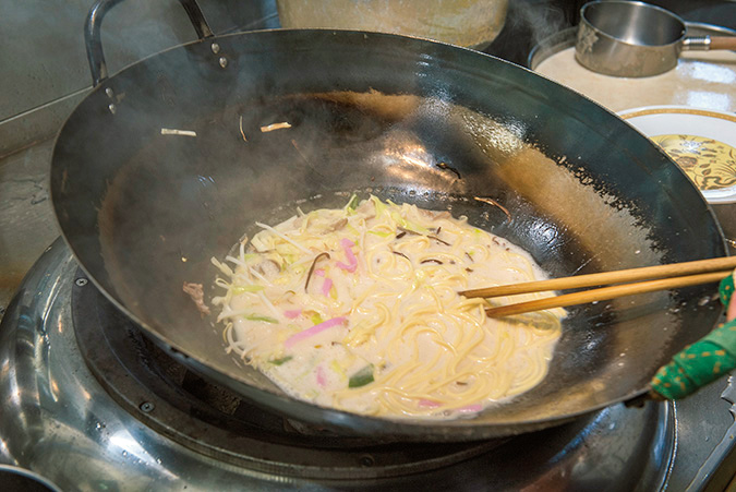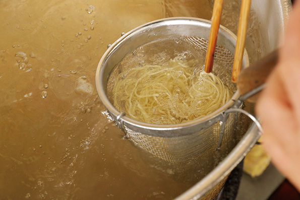 直径1.5mmほどの細打ちストレートの生麺。使用するのは120g。長崎のちゃんぽんとは異なり、煮込まずに湯がいて、鉢に麺を入れた上に具材とスープを注ぐ。やわらかくなりすぎないように茹で、スープを注ぐことでつるりとした喉越しになる。