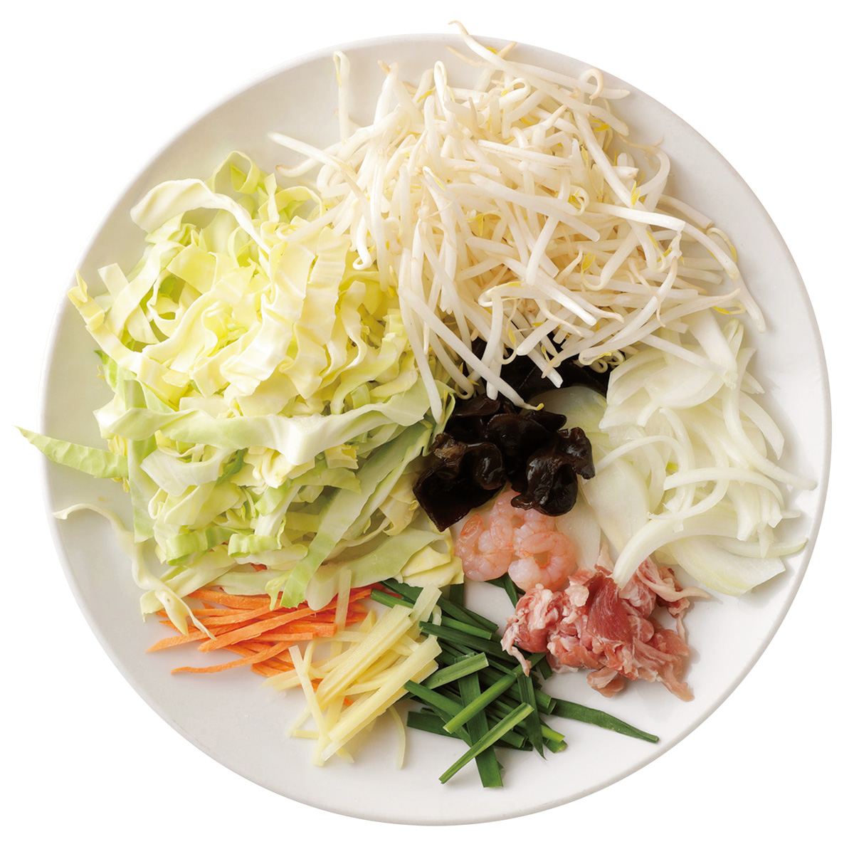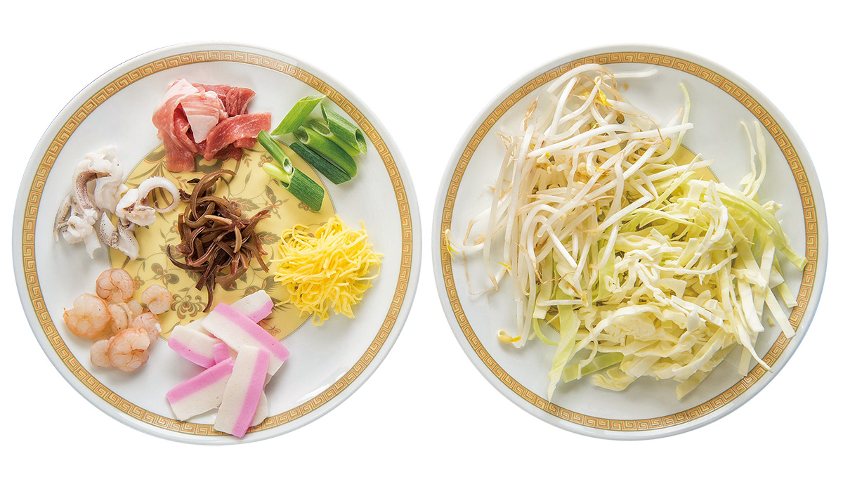具材は、豚肉、小海老、イカ、キクラゲ、キャベツ、もやし、ネギ、蒲鉾、錦糸卵。麺との絡みをよくするため、すべて細切り、短冊切りに長さと幅を揃えておく。錦糸卵は仕上げにトッピングする。キャベツともやしは手のひらいっぱいにたっぷりと。