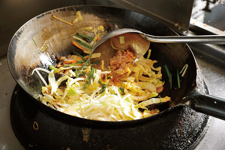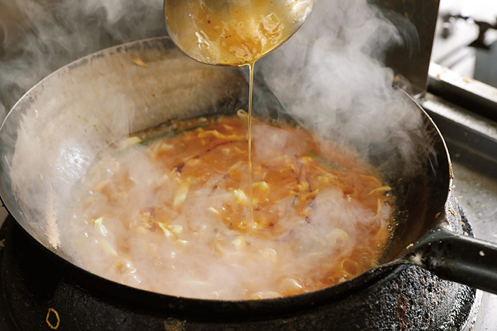 幅5mmほどの極太麺はかん水ではなく、唐灰汁を使ったもの。当初の「支那饂飩」というメニュー名を彷彿させる麺だ。つるりとしてやわらかく、程良いモッチリ感が特徴。細切りにした具材とよく絡み合い、食べごたえも十分。