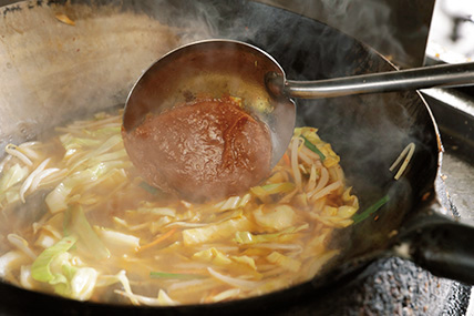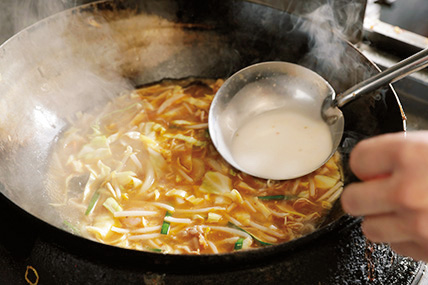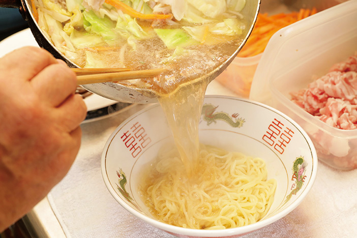 「ちゃんぽん」は塩味にするが、「みそちゃんぽん」はラー油小さじ1、豆板醤小さじ1、味噌大さじ1、自家製醤油と胡麻油を適量加えて味を調える。ピリ辛でコクがある。