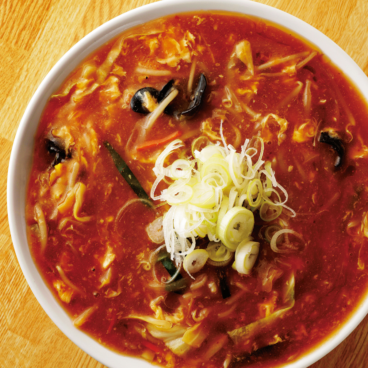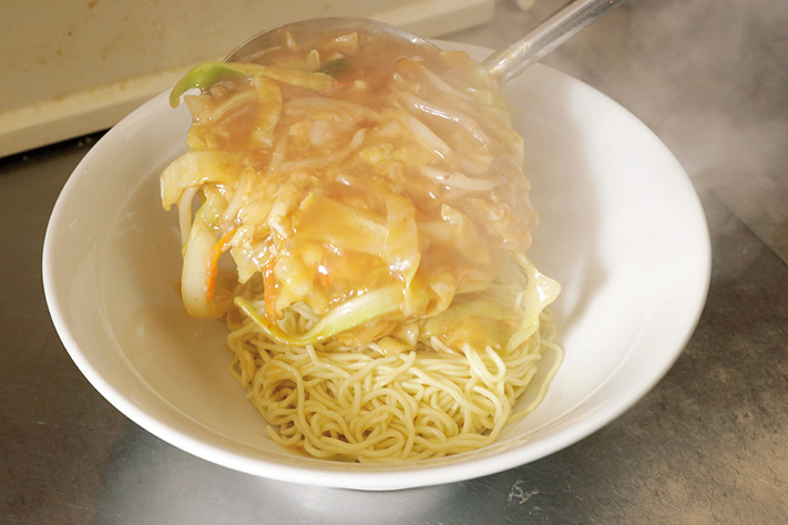 太さ1.5mmほどの細縮れ麺は生麺で130g。細切り具材やあんかけによく絡む。やや少なめに調整されており、たっぷりの具材でもあっという間に完食してしまうほど。ラーメン鉢の底に沈んでいるので、最初に具材とあんかけとよく混ぜ合わせよう。