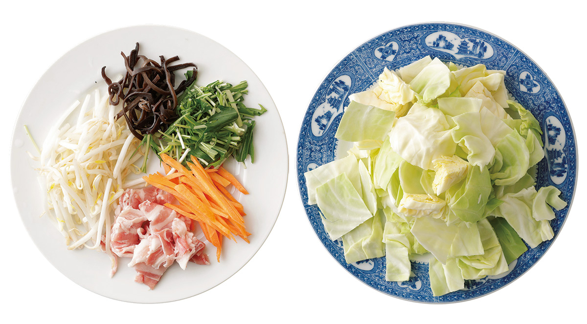 キャベツ150g、もやし、豚肉、人参、水菜、キクラゲは適量で。キャベツは食感を楽しむため大きめのザク切りに、ほかの具材は細めに切る。ネギの代わりに水菜を最後にトッピングする。ネギ、ニラを入れないのであっさりとして優しい味わい。