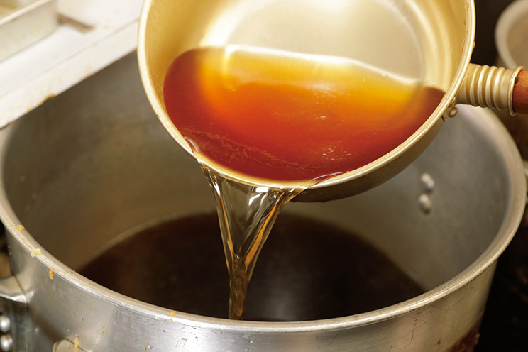 2 スープ500cc程度を入れる。薄口醤油(長崎県産)大さじ1、色付けに濃口醤油を入れスープの味と色を出す。