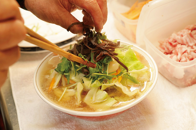 3 水菜とキクラゲをトッピングし完成。途中で酢を少しかけ回し、味を変えて楽しむのもおすすめ。