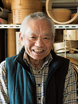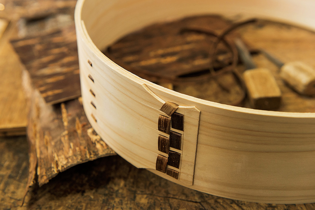 昭和8年に創業した曲げ物専門店・大川セイロ店は、今もなお、昔ながらの製法で、曲げ物を作り続けている。なかでもこだわっているのは、蒸篭の胴の接続部分に桜の皮を使うこと。ホッチキスなら数秒でできてしまう作業だが、あえて手間と時間と材料費をかけて、桜の皮でつなぐ。桜の皮を使ったこの製法は平安時代より前から続いているといわれ、現在東京で行っているのはここだけだという。