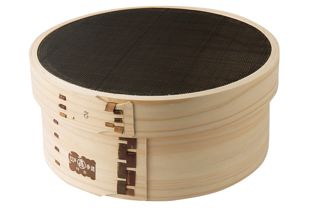 馬の尻尾の毛を使った漉し器も、大川セイロ店自慢の製品。ご主人が曲げ物の技術で胴部分を作り、奥様が馬毛を編んで網目を作るという、ご夫婦の優れた技術が1つになった芸術品だ。網目は小さめの機織り機で、1本1本丁寧に編みこんでいく。中国製の安い品も多いが、ここのできばえは何ランクも上。網目部分をグッと押しても、たわむことなくピンとはったまま。規則正しい網目も、プロからの注文が絶えない理由のひとつだ。