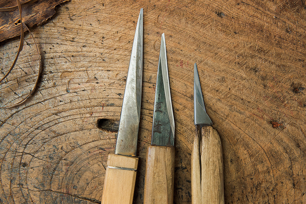 胴輪を削るための小刀。これはサイズ違いではなく、元々は同じ大きさの刃。右は20年間使い込んだもの。変形した柄の部分まで歴史を物語っている。小刀の刃は、信頼する鍛冶職人によるもの。