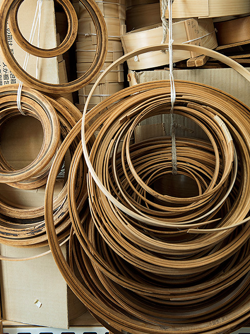 木を細く裂いて作った、蒸篭の一部分となる「ウズ」。工房の中には、様々な大きさのウズが並ぶ。