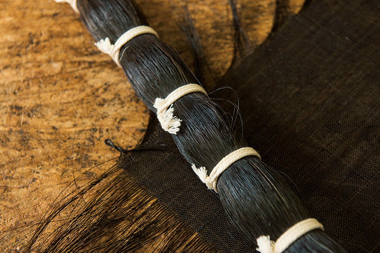 馬の尾の毛(写真上)を使って織り上げた漉し器の網。縦横の毛が均等に配され、網の目の形もすべて同サイズの正方形に整っている。この美しい網目は、ここででしか生み出せない。
