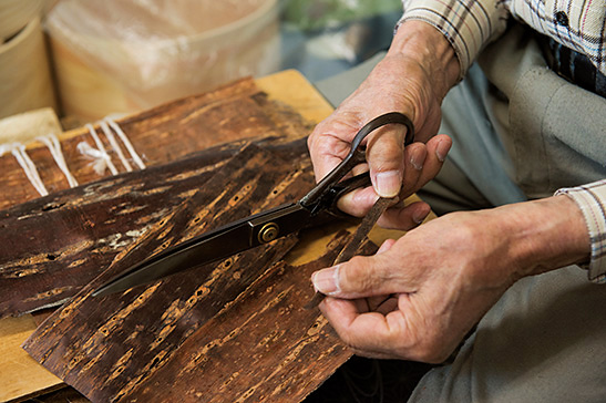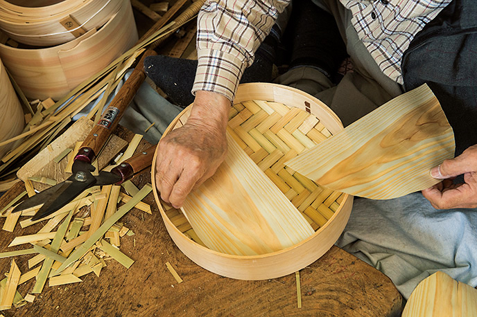 昭和8年に創業した曲げ物専門店・大川セイロ店は、今もなお、昔ながらの製法で、曲げ物を作り続けている。なかでもこだわっているのは、蒸篭の胴の接続部分に桜の皮を使うこと。ホッチキスなら数秒でできてしまう作業だが、あえて手間と時間と材料費をかけて、桜の皮でつなぐ。桜の皮を使ったこの製法は平安時代より前から続いているといわれ、現在東京で行っているのはここだけだという。