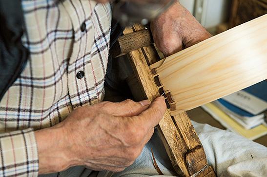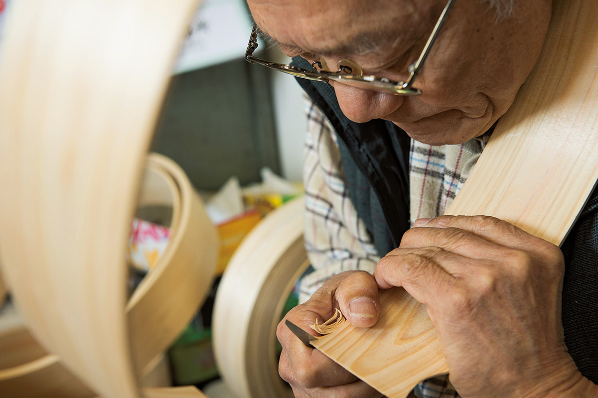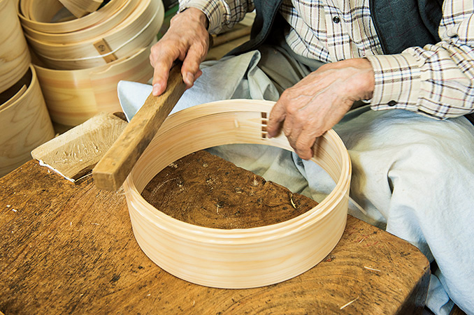 セイロの胴部分で、輪が重なり合う端の片方を、小刀を使って丸く削る。この作業を「まちをかく」といい、削る長さや曲線の形は、職人により異なる。目分量で削るのだが、まったく同じに形に仕上がるのが職人技だ。