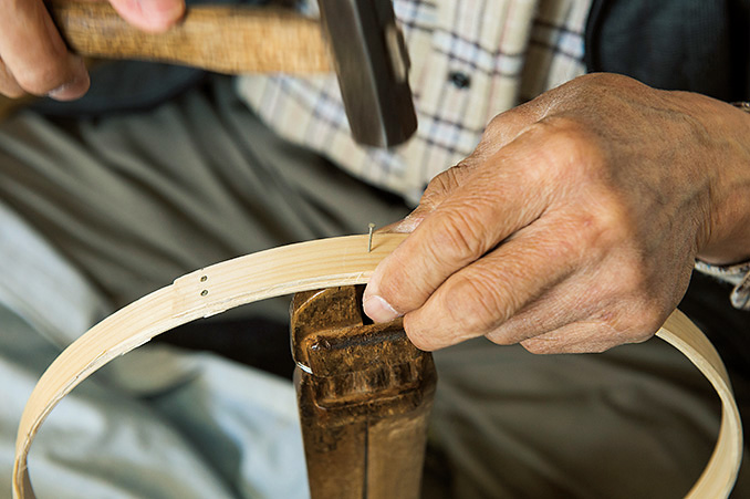 蒸篭の胴輪に穴を開け、桜の皮を通してしっかりとつなぎ合わせる、匠の技のひとつ。