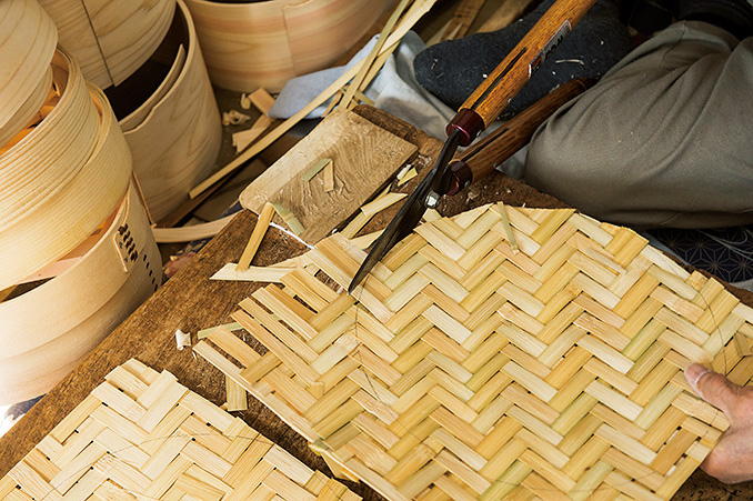 蒸篭を作るうえで、いかに蒸気を漏らさない品を作れるかというのも、職人の腕が問われるところ。サクサクと流れるように作業を進める大川さんだが、ほとんど定規は使わず、ほぼ目分量で作業を進めている。それでも気持ちいいほど、部品と部品がガチっとハマり、隙間のない完璧な蒸篭に仕上げていく。蒸気を漏らさないという構造については、蓋の部分にも工夫が隠されている。2枚重ねて使うあじろは、竹の網目を45度回転させ、ずらして重ねることで網目の隙間をふさいでいる。さらに大川セイロ店の品には特別な工夫が。2枚のあじろの間に、経木をはさんでいるため、より密閉度を高めている。こうしたひと手間が、より高品質な商品を生んでいるのだ。