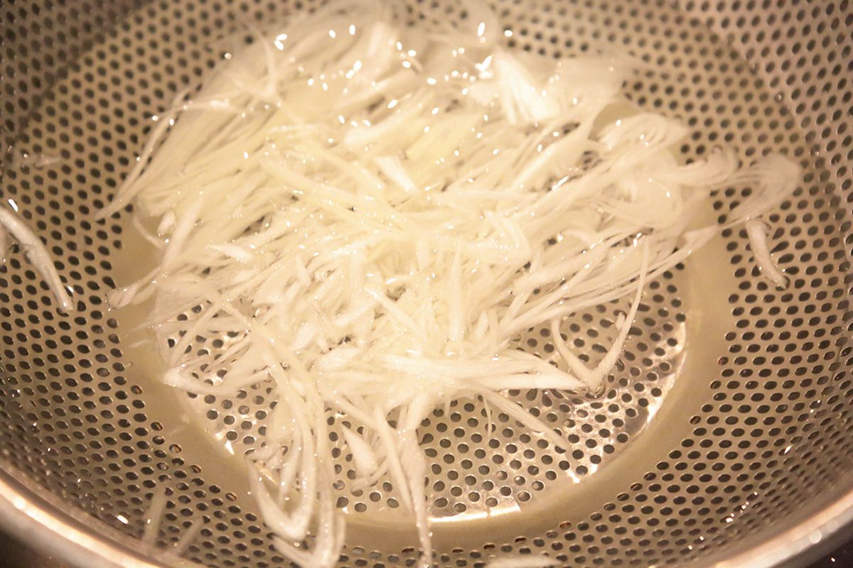 1 薄く斜め切りした白ネギは水にさらし、ネギ特有の辛味を取り去っておく。