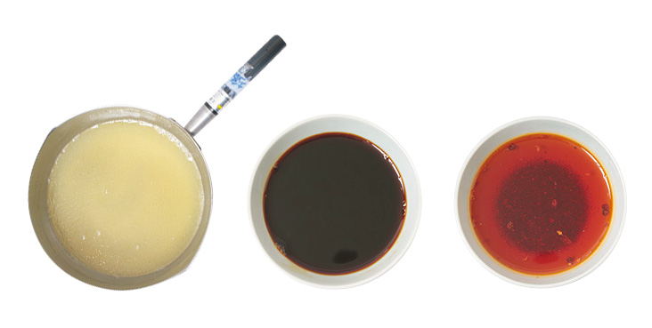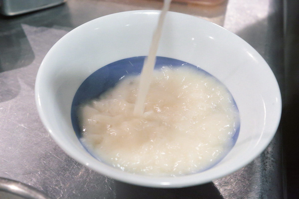 3 清湯スープを300g流し入れ、2が清湯スープと溶け合わさるように、手早く混ぜ合わせる。