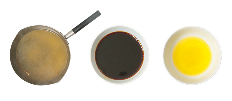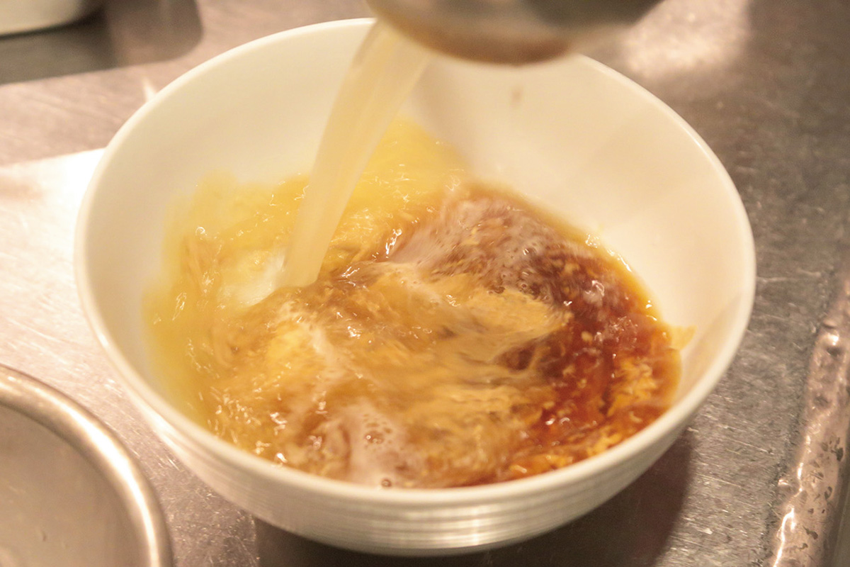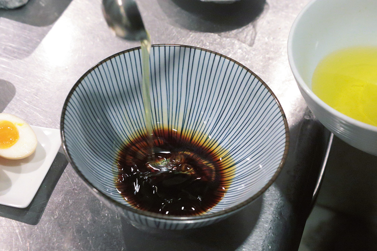 2 醤油ダレ(30g)を丼ぶりに注ぎ入れ、鶏油(20g)を足し入れる。
