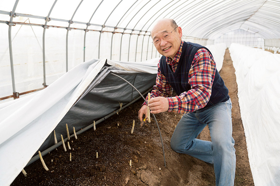 「ホワイトアスパラガスの栽培には水が欠かせません。稲作農家でもある野口さんは、籾殻を燻した燻炭と牛糞を発酵させた堆肥などで作った肥料を使っています。燻炭は土の保水力と保肥力を高めるだけでなく、土中の虫が微生物を食べてくれます。おかげで瑞々しくて、甘みが強いホワイトアスパラガスが育ちます」(植村隆昭氏)