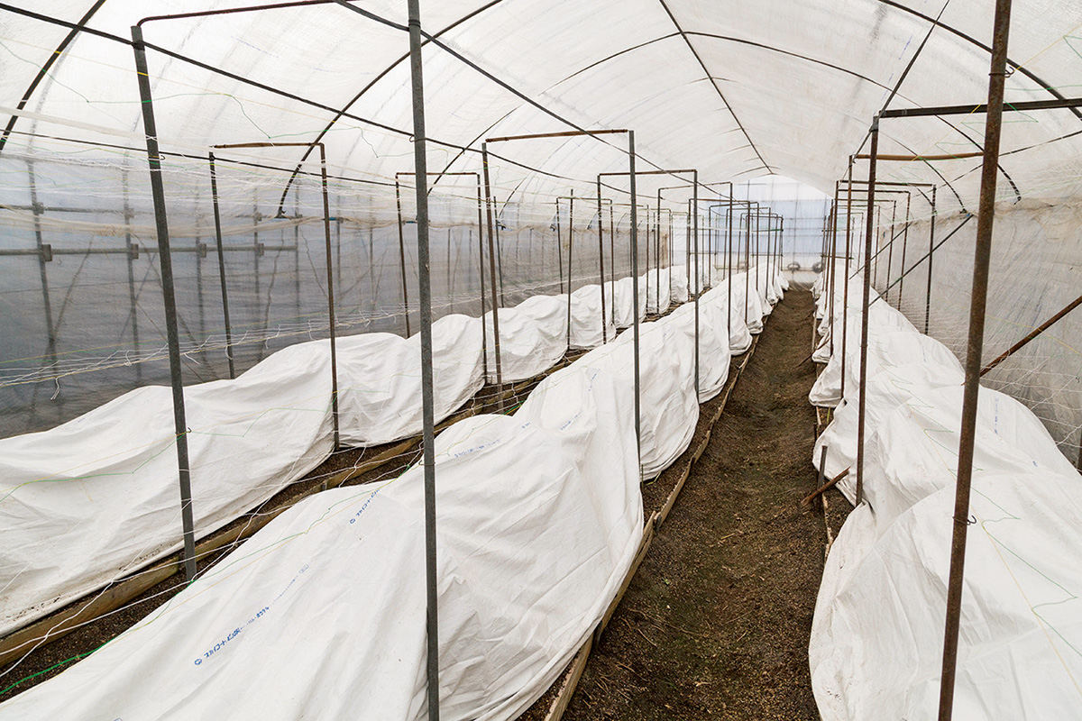 このビニー ルハウスでは、グリーンアスパラガス1本1本に遮光フィルム製キャップを被せる方法でもホワイトアスパラガスを育てていた。