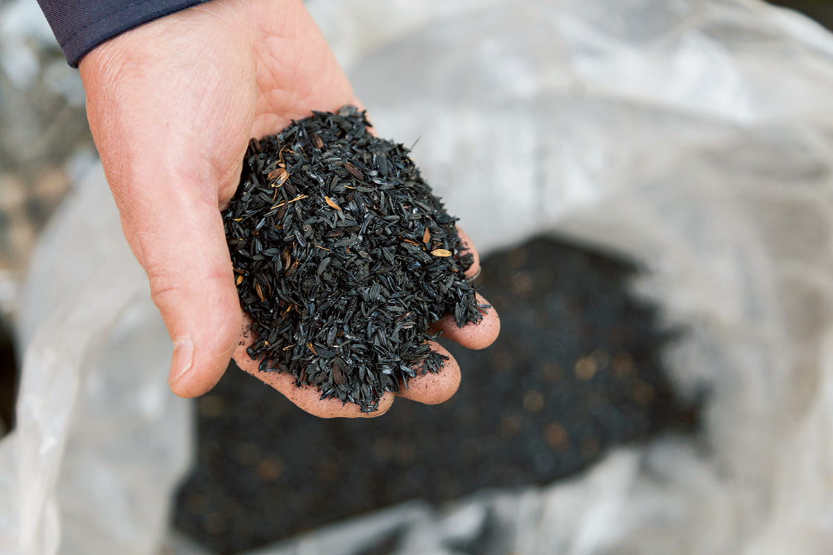 野口氏が愛用している燻炭。自家栽培した米(ヒノヒカリ)の籾殻を燻して作った燻炭に、牛糞を発酵させた堆肥などを混ぜた肥料を用いた畑でホワイトアスパラガスを生産している。保水力が高い燻炭のおかげで、野口氏の畑は雨が降った後のようにしっとりと濡れていた。