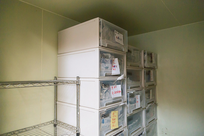 うえむら農園では味の劣化を防ぐため、各組合員から届いたホワイトアスパラガスを冷蔵庫でひと晩冷やしてから出荷する。