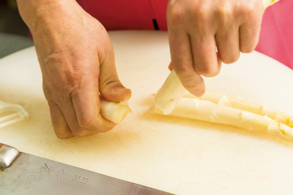 うえむら農園のホワイトアスパラガスは硬い部分はほとんどなかったが、長坂シェフは根っこの部分を取り除いてから料理を始めた。