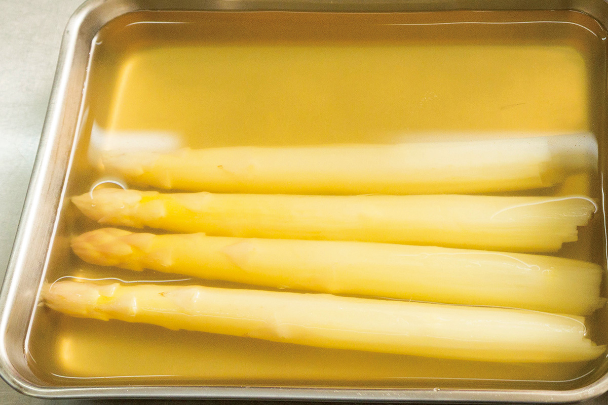 スポンジのような素材だからこそ様々な調理ができる。一方、グリーンアスパラガスは調理法が限られる。味を染み込ませるのに時間がかかり、色が飛びやすいというのだ。