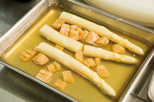 1 ホワイトアスパラガスをバットに入れ、干し貝柱(400ccのチキンスープで戻しておく)とその戻し汁を加え、10分蒸す。3つに切る。