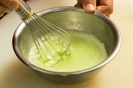 2 茹でたグリーンピースに残りのチキンスープを加え、ミキサーにかけ、裏漉しする。清湯、生クリームを加え混ぜる。塩コショウする。