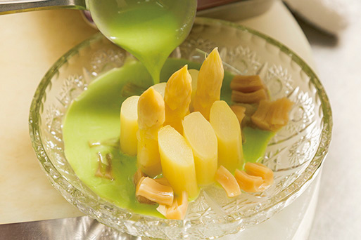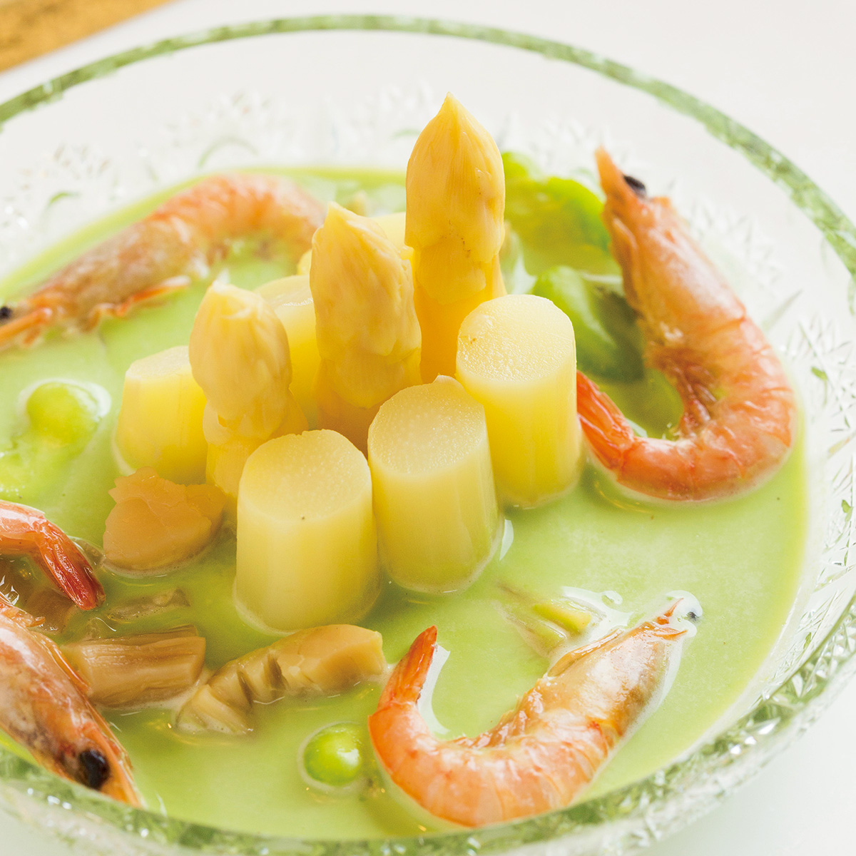 4 1のホワイトアスパラガスを器に盛り、貝柱を入れる。2のグリーンピースのソースを注ぎ、3のむき海老とソラマメを盛り付ける。