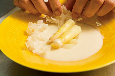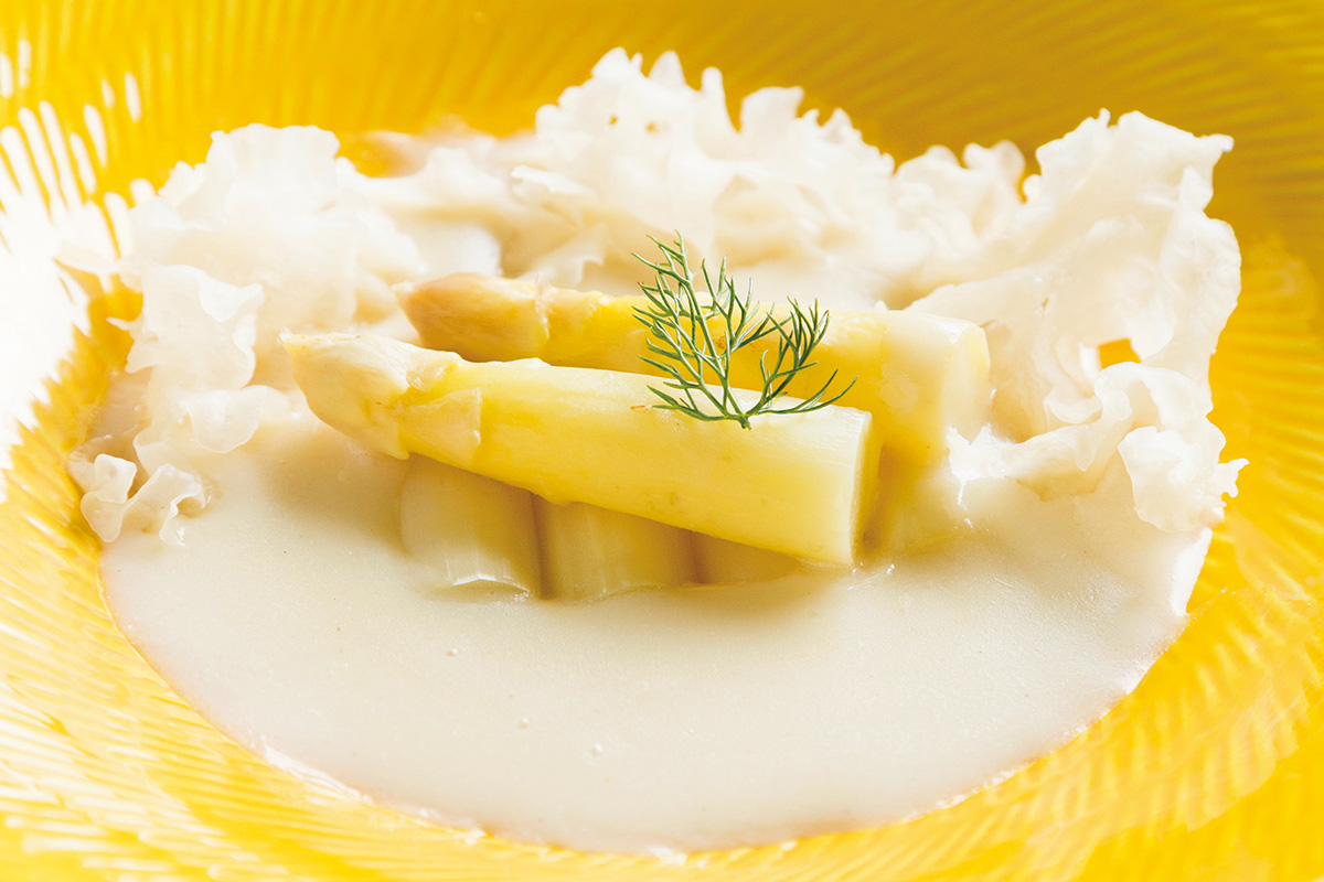 老酒を入れた清湯で蒸したホワイトアスパラガスに豆乳のスープをかけ、白キクラゲをあしらった白い一皿。