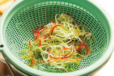 2 白ネギを細く切り、水にさらした後、水を切っておく。赤パプリカも同様に準備しておく。1のベーコンを8mm幅に切る。
