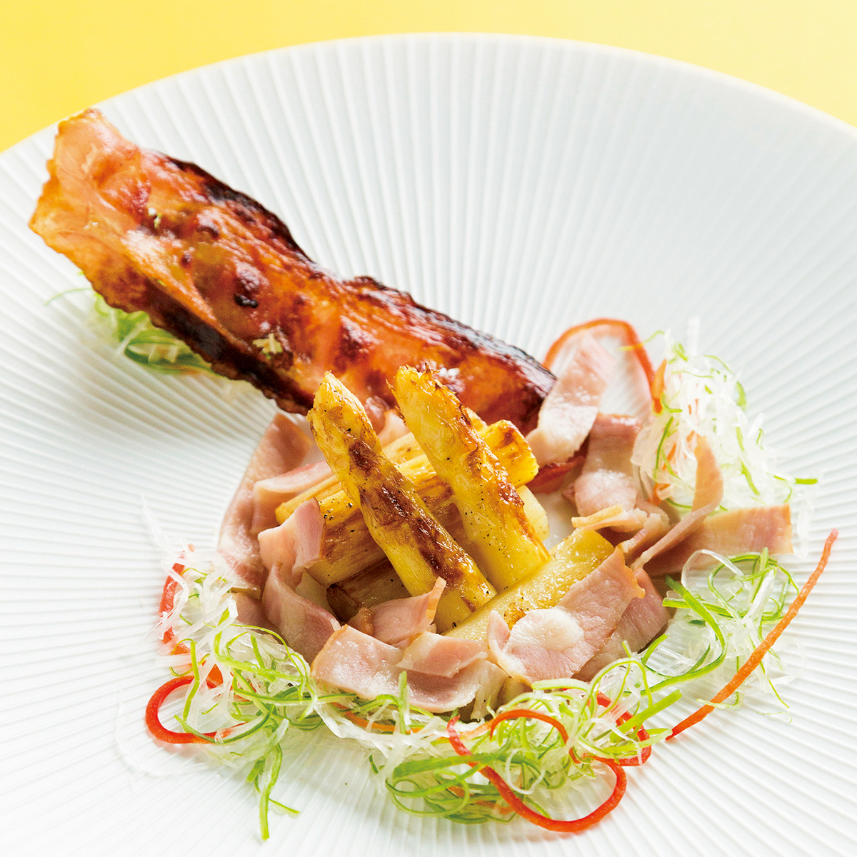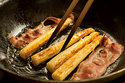 ホワイトアスパラガスをベーコンを加えたチキンスープで蒸した後、ベーコンと一緒に炒めることでベーコンの香りを含んだ濃厚な味に仕上げる。
