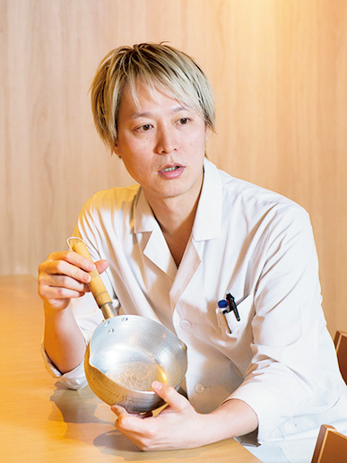「当店で使っている雪平は長いもので15年ものです。職人の手で造られた雪平鍋は、同じように見えて熱の電動率が異なります。また雪平自体が熱しやすく、冷めやすいため、熟知するまでには時間が必要です。雪平鍋が欠かせない料理として、鯛のあら焚きを作りました。水、煮切り酒、濃口醤油、みりんに上白糖という、日本料理ならではの引き算の料理を作る上では雪平鍋は欠かせない道具だと思います」