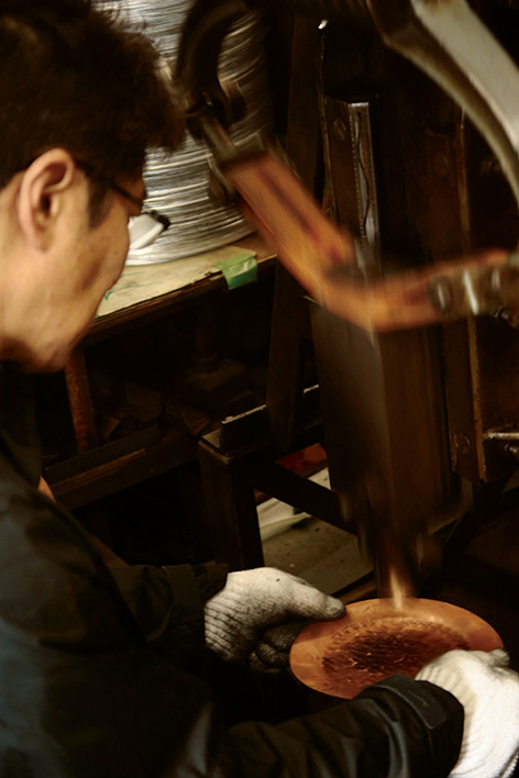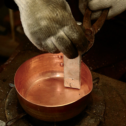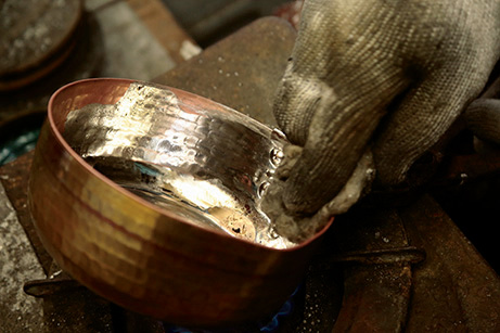その後、鍋の形に形成し、銅をやわらかくするために火入れをする。