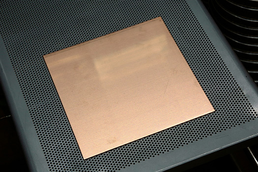 はじめに底打ちと呼ばれる底面の打ち込みを施し、打ち込みによって湾曲してしまった銅板に一度プレスを掛け平らな状態に戻す。