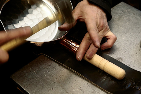 さらにサイドをハンマーで均一に打ち込み、ハンドル部分の金具を取り付けたら、鍋の内側に錫を溶かしまんべんなくコーティングする。
