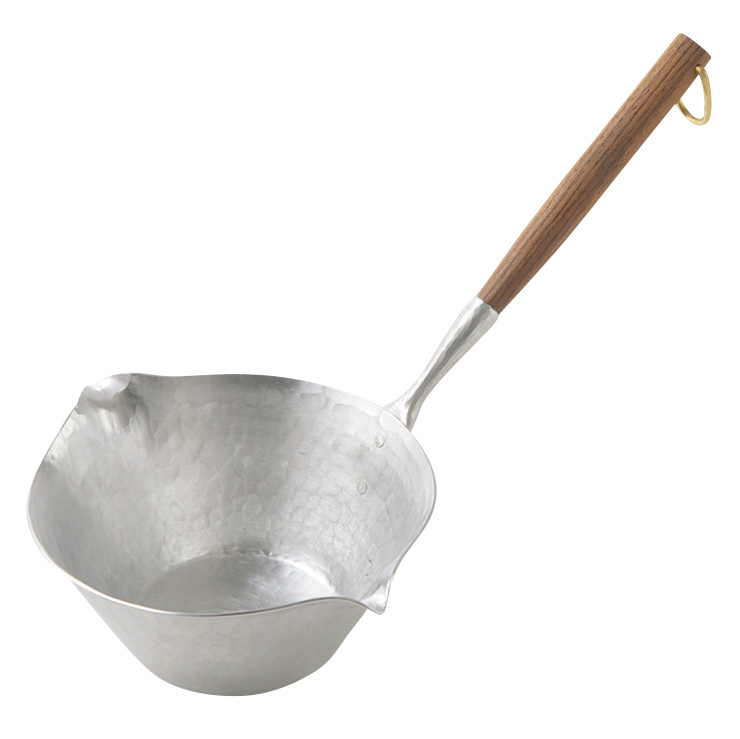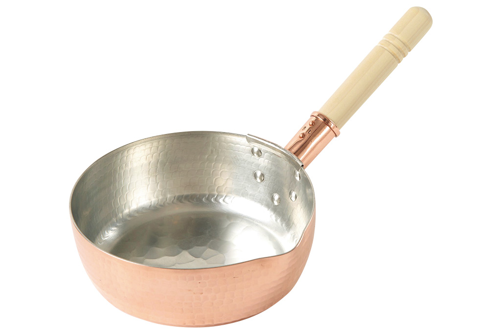 鍋の表面を打ち出し、全体的に打ち柄の入った雪平鍋。現在、火を使わないIHコンロなどの急速な普及もあり、また調理の際、鍋に料理が焦げ付かないことを謳ったテフロン加工が施された鍋などが、調理鍋の台頭を成し、一般家庭で見ることも少なくなった。むしろ雪平鍋自体の存在さえ知らないという若者もいることだろう。ひと昔前、30代、40代以上の年齢の人であれば、実家の台所にひとつやふたつはあったことを思い出すはず。それほどまでに、日本人の台所に必要不可欠な鍋で、旧くから庶民に愛されてきた料理器具のひとつ。もちろん、現在でもプロの料理人を始め、家庭においても雪平鍋の愛用者は、あとを絶たない。
