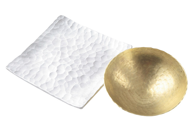 「アルミ四角皿(1944円)」と「真鍮豆皿(1944円)」