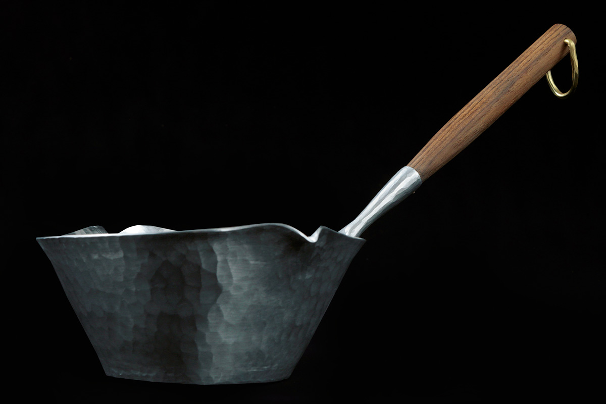 「Denmark Yukihira」と名付けられた小鍋。北欧の台所に馴染むような雪平鍋というコンセプトでこの鍋を生み出したのは大阪に拠点を置く鍛金師・稲垣大氏である。プレス機で製造される量産品と比較することがはばかれるほどに、この雪平鍋の表情には目を奪われる。