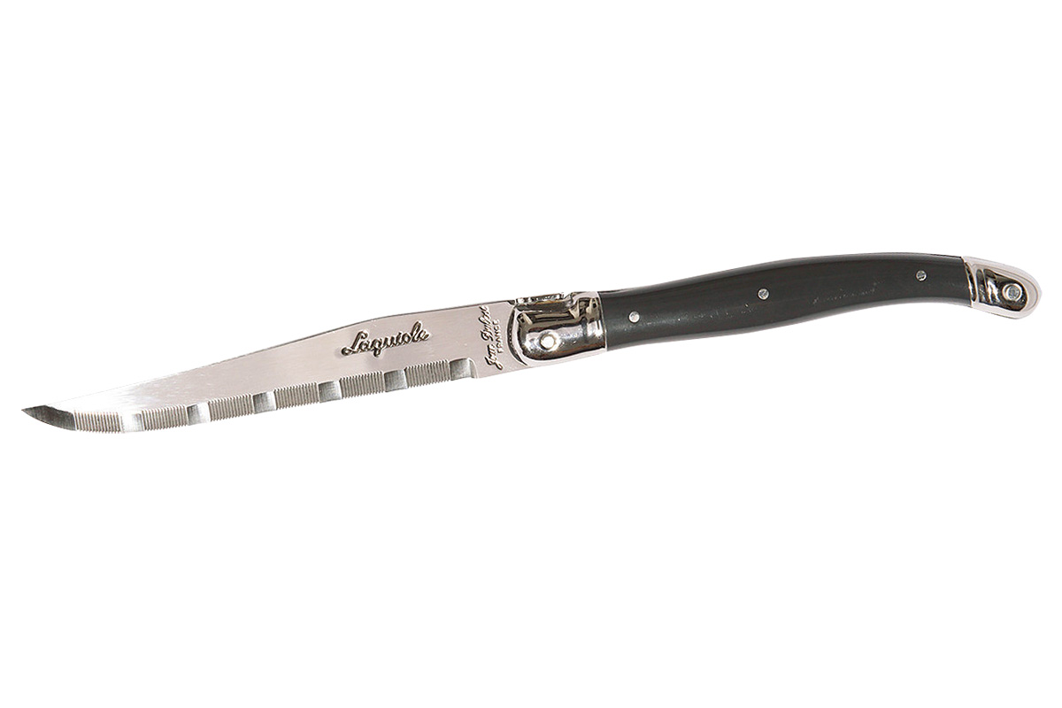 刃にセレーション(ギザ状)加工が施されたナイフは “切る” ことに快感を与える。カラーバリエーションが豊富なので、あえて色を揃えないのも洒脱! ジャン・デュポ ライヨール(ザッカワークス)