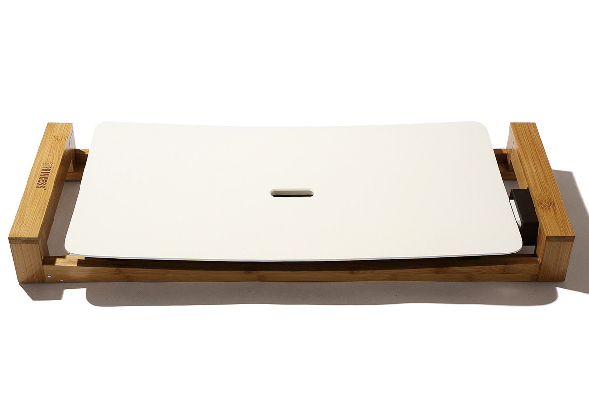 摩訶不思議な白い板。これがホットプレートだとは、誰が想像するだろうか。おもむろに食材を載せ、ジュッと音がすれば、場は歓喜で包まれることであろう。「テーブルグリルピュア」プリンセス(コレド https://princess-jp.com/table_grill_pure.html)