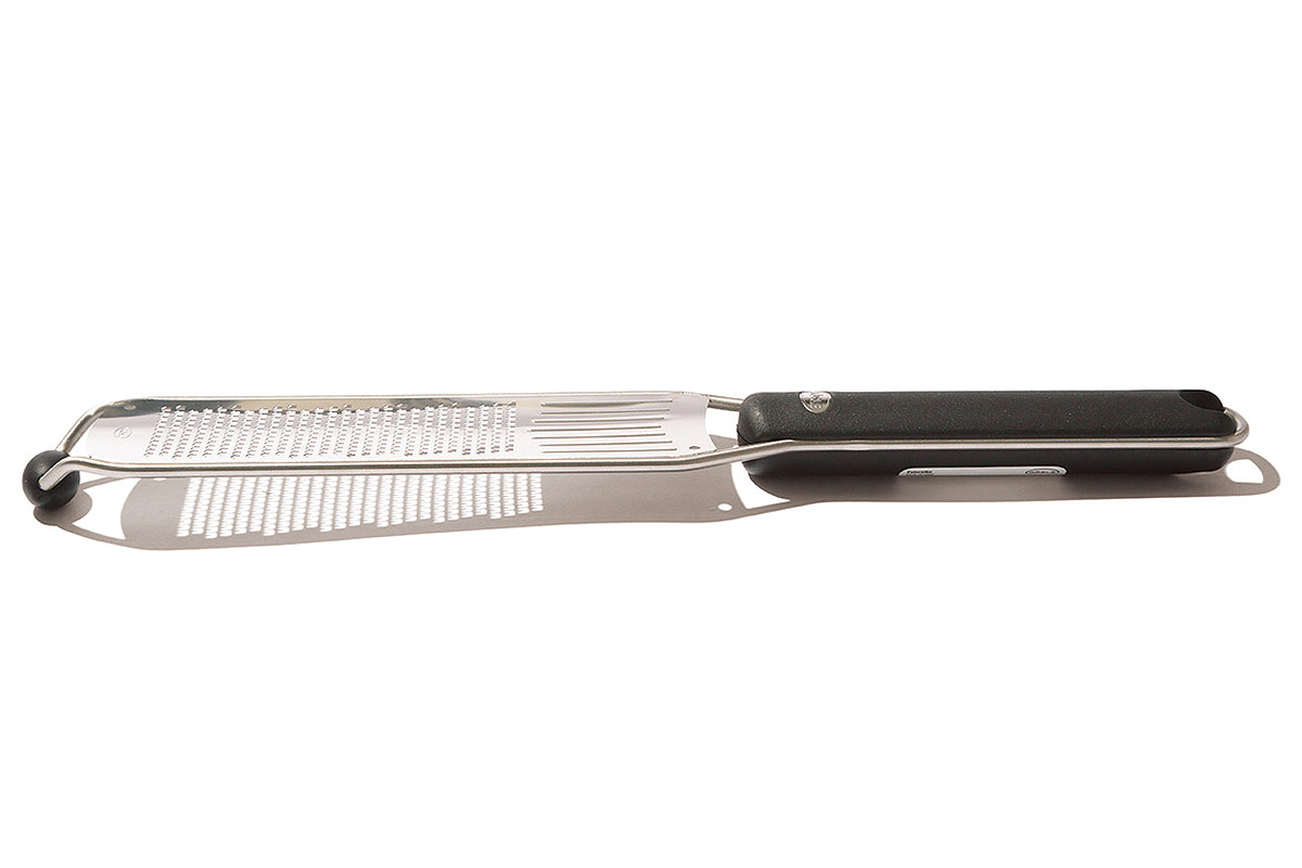 黒皿で提供した料理に、白い粉雪のようなパルミジャーノを振りかける。これぞ、視覚に訴える仕上げ術だ。グレーターは刃の細かさと、刃自体の切れ味が別格なドイツ製のコイツで決まり! レズレー(飯田屋 https://kappa-iida.com/)