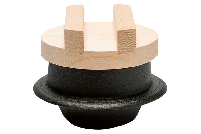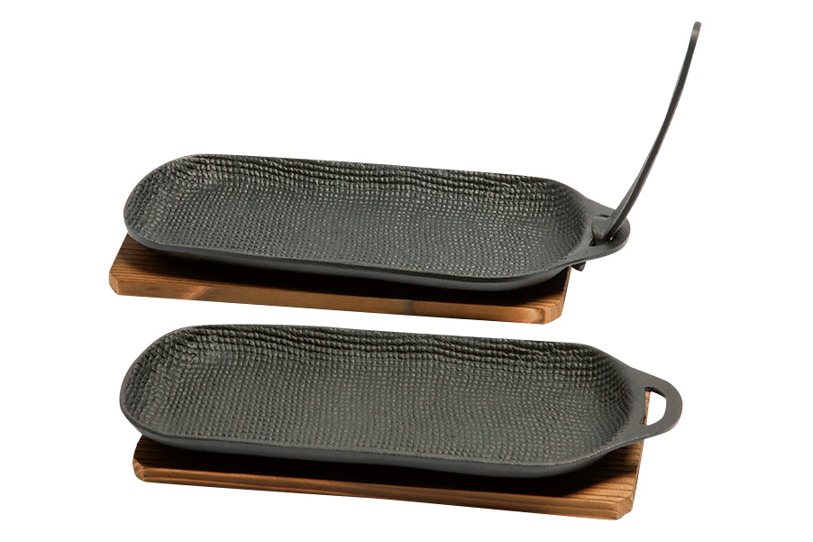 ガスコンロや、魚焼きグリルに入れても使える細身の鉄製焼き皿。脱着式専用ハンドルが付いているので、アツアツのまま木台に乗せて食卓へ出してもOK。(及源鋳造 TEL/0197-24-2411)
