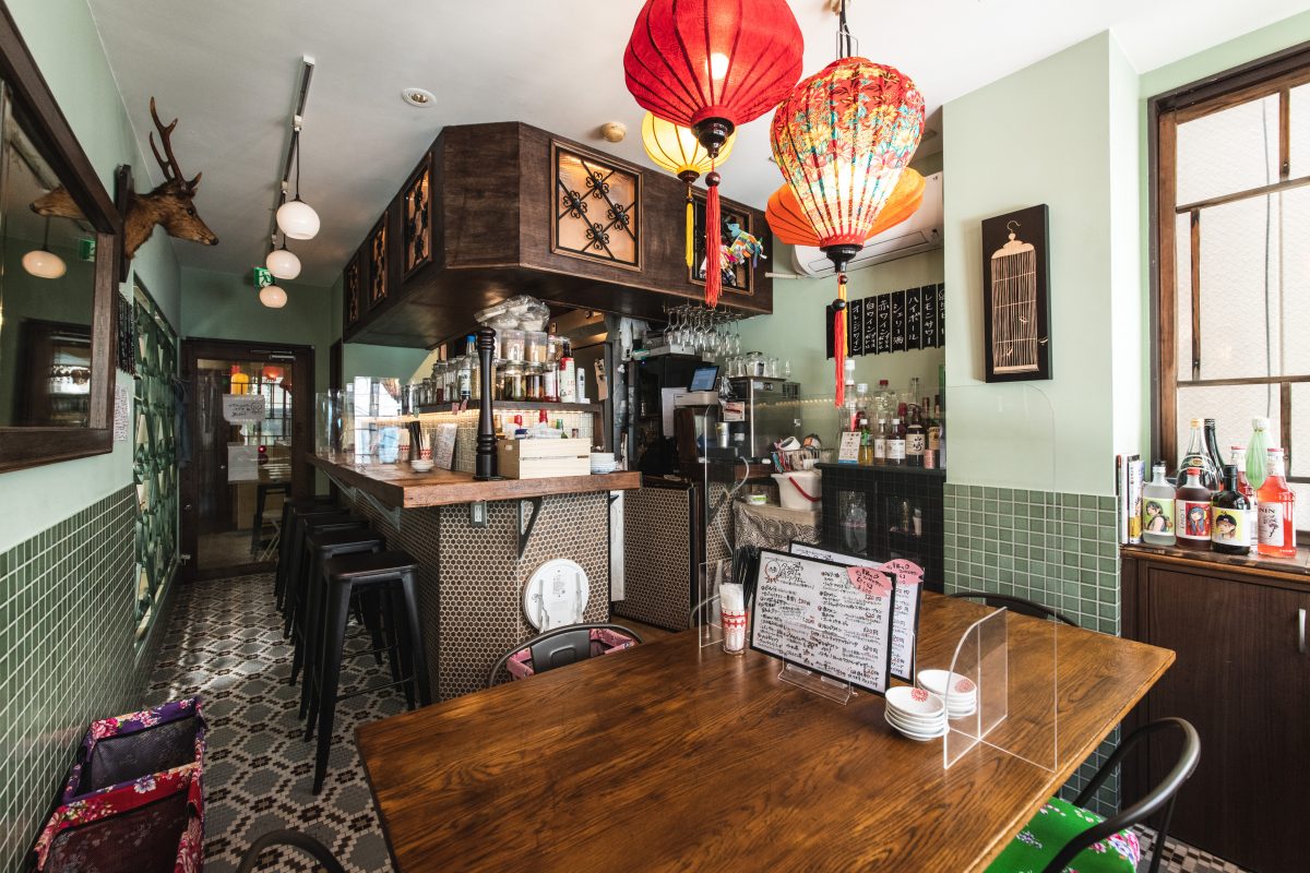 どこの国をイメージしているのかわからない、独特な装飾の店内。カウンターは今後立ち飲みスペースになるという構想も。たこ焼きでチョイ飲み、最高だなあ。