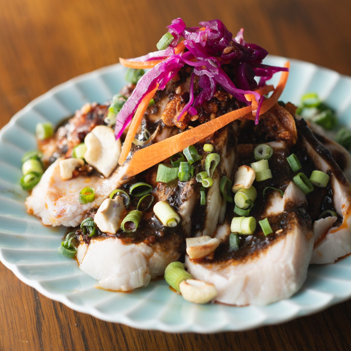 蒸し鶏は写真の「黒胡麻よだれ鶏(480円)」と「ニラミントソースがけ(500円)」の2種。やわらかく仕上げた鶏肉に、黒ゴマとカシューナッツ、山椒、レモングラスのような独特の香りが特徴的なマーガオなどを使うソースが絶品。