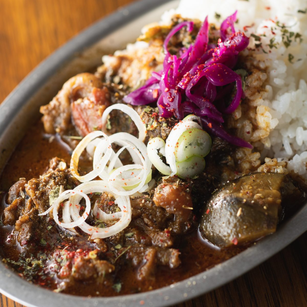 コレ目当てに来る人も多いカレーは写真の「和牛スジ肉カレー(ごはん有780円)」など2種用意。甘みに頼らずスパイスと具材の味をストレートに楽しめる、スパイスカレーファンなら必食のひと品だ。つまみにしても抜群。