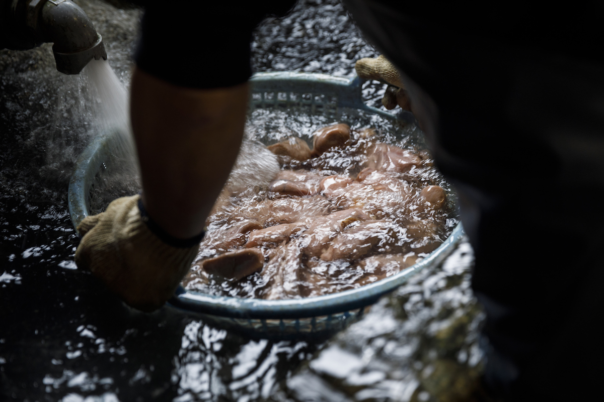 「創業時から製造工程はほぼ変わっていません」。そう語るのは、7代目の荒木敏明さん。身から切り離された卵巣は、手取川の伏流水でよく洗ってから塩蔵する。その期間は約1年。