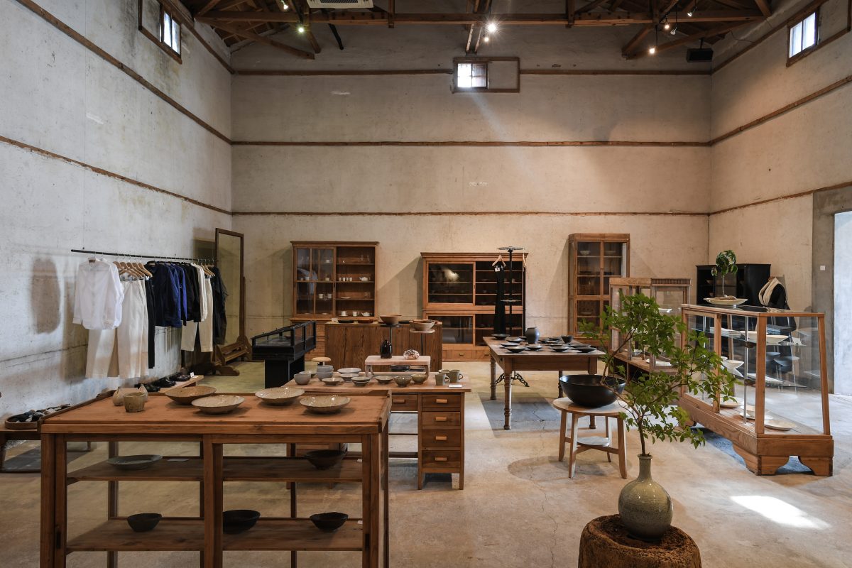 夫妻がまず立ち寄ったのは、インテリアのセレクトショップ『pejite 益子』。築80年になる米の貯蔵蔵を再利用した店の外壁を覆う蔦は、春は新緑、秋には数日だけ紅葉も楽しめるという。古くは明治から昭和初期に作られた趣深い日本のアンティーク品の中には、古い燭台を使った照明などのオリジナル商品もあり、紺野さんは以前この店で購入した、スタンドライトやシェルフを愛用しているという。地元の益子や笠間を拠点にする作家のうつわも多く取り揃え、紺野さん夫妻は一点一点吟味するように手に取る。「うつわを選ぶ時は、あまり用途などは考えず、作品性やフィーリングを大事にしています。家に帰ってじっくり器を眺めながら、どんな料理を盛り付けるか想像を巡らせるのも楽しみの一つです」。この日、二人が選んだのは、かつて益子を拠点としていた、世界的人気の陶芸家・二階堂明弘さんの白い平皿。紺野さんのうつわコレクションは、日本の作家ものから国内外のアンティークまで多岐にわたるが、店で使用しているものはそのほんの一部。この皿も、まずは自宅で特別な日に使いたいという。